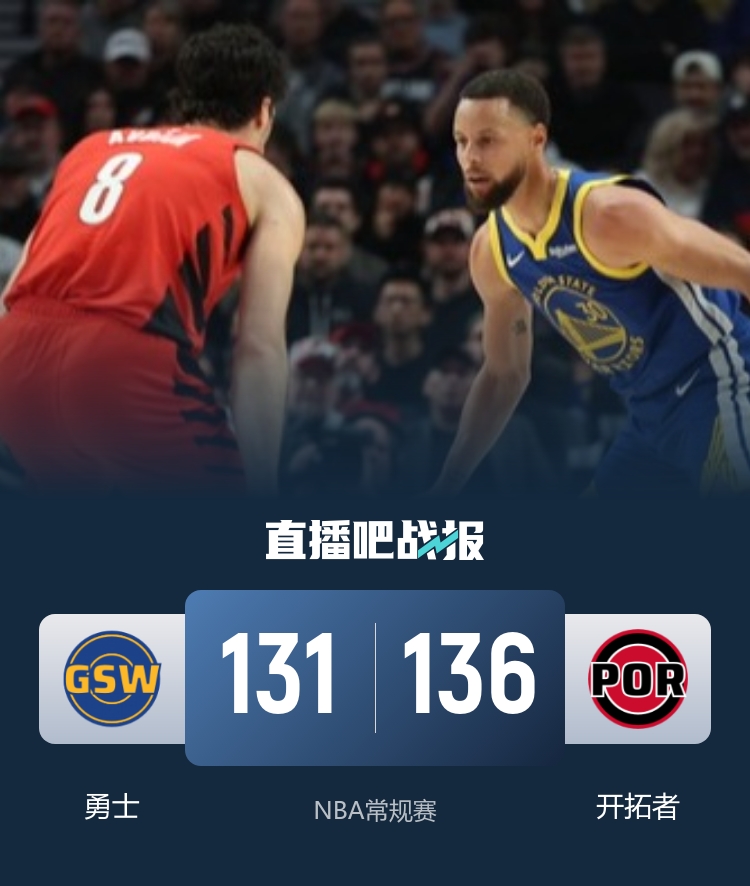 首节开打后库里早早开张连中三分,夏普和阿夫迪亚轮番打进,末段两队接连打出小高潮,首节结束时开拓者领先3分,次节回来,格兰特持续发力率队占优,库里和巴特勒接连冲击,追梦续上火力,三人联手率队后来居上,半场战罢,勇士反超1分。短暂休整后两队继续对攻,夏普手感发烫对飚库里,追梦突然断电连送失误,三节结束后勇士仍然领先3分,末节决战,库里无人可挡外线连续发炮,但格兰特手风正顺强势回应,决胜时刻库里遭夹击出球被断,勇士关键挑战失败,格兰特两罚全中锁定胜局,最终开拓者136-131力克对手终结三连败。