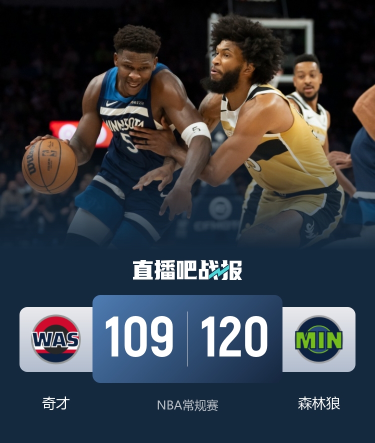 开场后两队还打得有来有往,奇才一度取得领先,不过爱德华兹表现活跃单节得分上双帮助森林狼反超比分。进入轮换阵容后奇才进攻效率下降,森林狼趁机巩固优势。第二节森林狼延续攻势,里德状态火热砍分如探囊取物,在他的发挥下森林狼打出16-0的高潮一举将分差拉大到20分以上。但下半场回来森林狼状态下滑,奇才趁机掀起反扑缩小分差。最后一节森林狼进攻打得依旧不理想,奇才继续将分差缩小到个位数。关键时刻森林狼稳住阵脚没有让奇才翻盘,最终森林狼120-109击败奇才取得2连胜,奇才遭遇12连败。